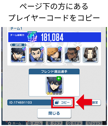 - ※プレイヤーコードは『ブルーロックPWC』のメニュー>>プロフィールからコピー出来ます。